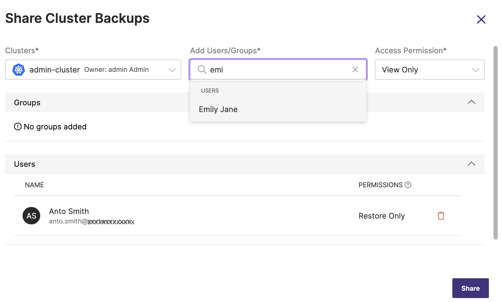 The users and/or groups with whom you want to share all backups of the cluster will be displayed in the Share Cluster Backups window.