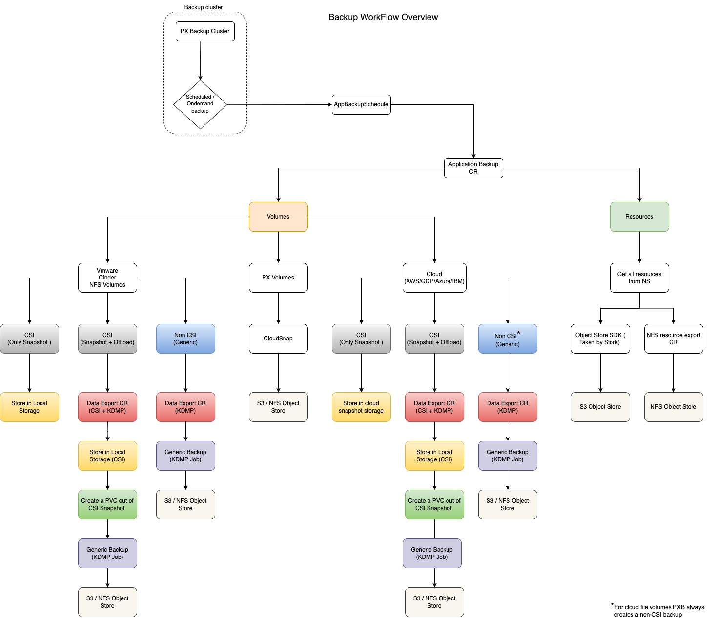 The below illustration represents the Backup workflow overview for Portworx Backup (PXB), illustrating how application backups are scheduled and executed across different volume types and storage backends. It covers various volume sources (VMware, Cinder, NFS, Cloud, PX Volumes) and how backups are processed based on whether they use CSI (Container Storage Interface) or Non-CSI (Generic/KDMP) methods. The workflow also includes resource backups for namespace objects using Stork and NFS Resource Export.