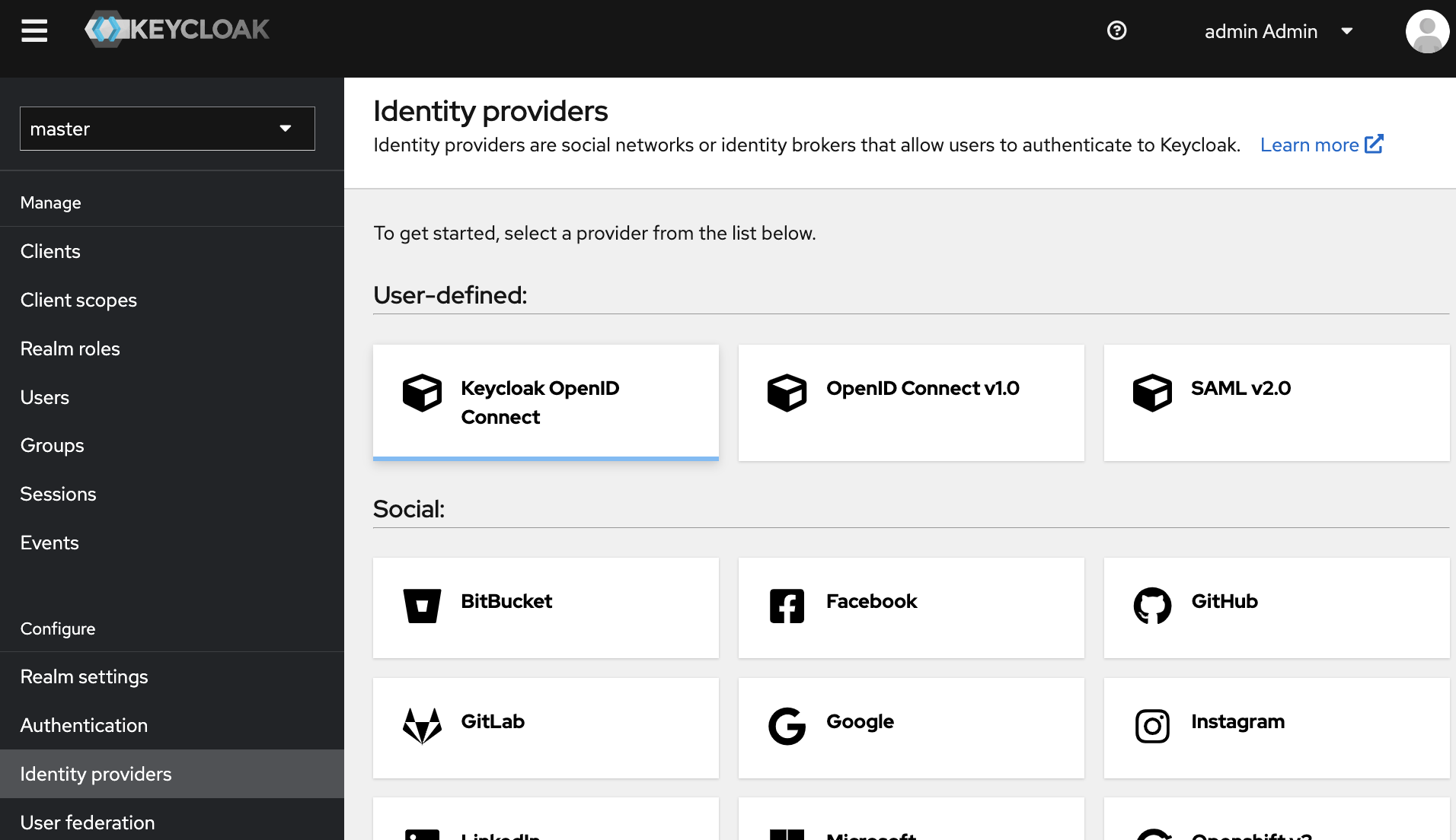 In the left navigation pane of home page, under Configure click Identity Providers and then select Keycloak OpenID Connect under User-defined:.