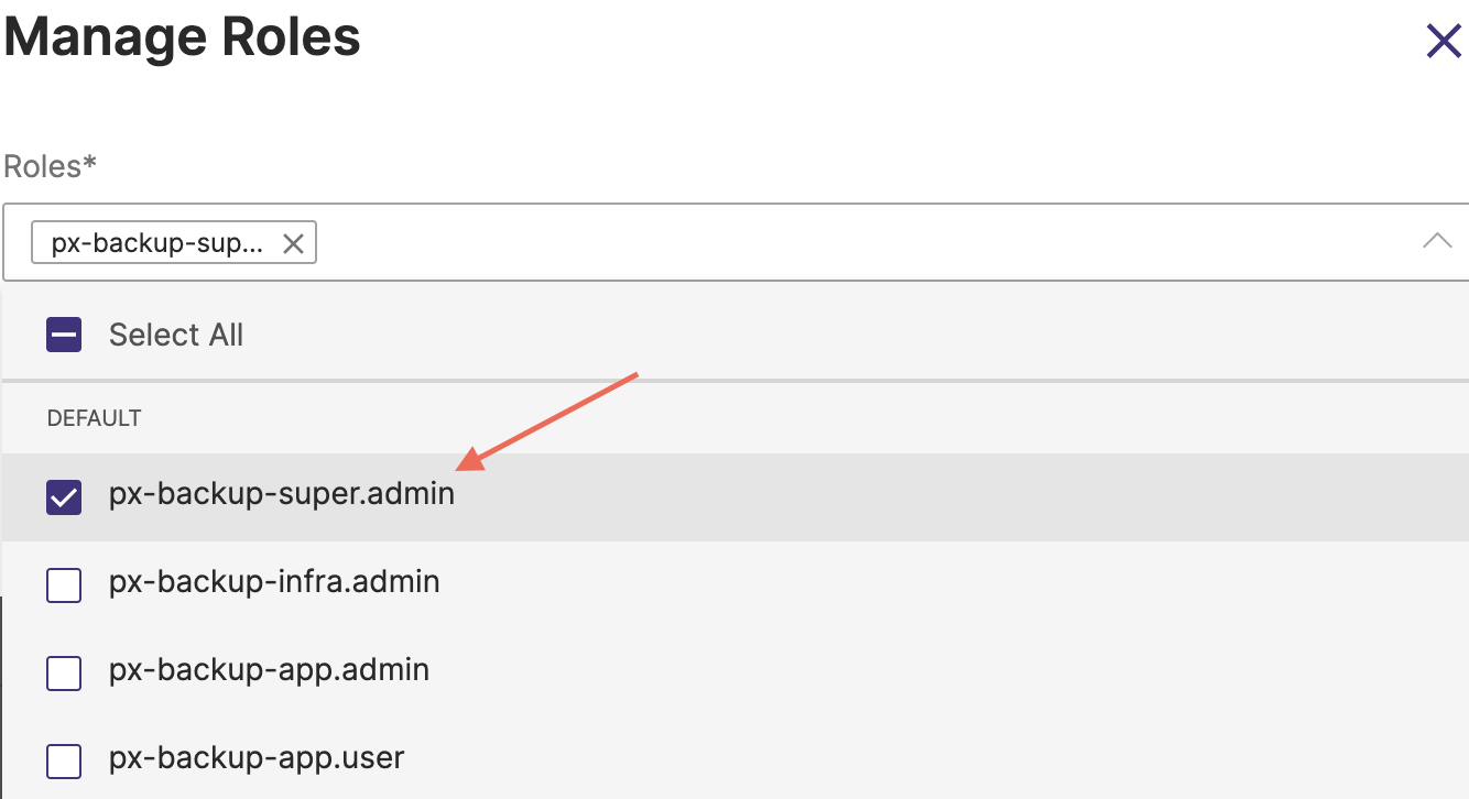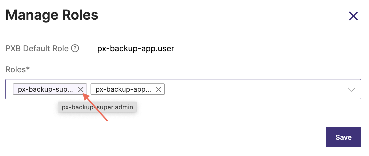 - To avoid a gap after revoking PXB (either default roles or custom roles) role, Portworx by PureStorage recommends to have at least one or two other super admins with equivalent access before removing the role of the identified user. If no other super admin role exists in PXB, consider creating one before proceeding.