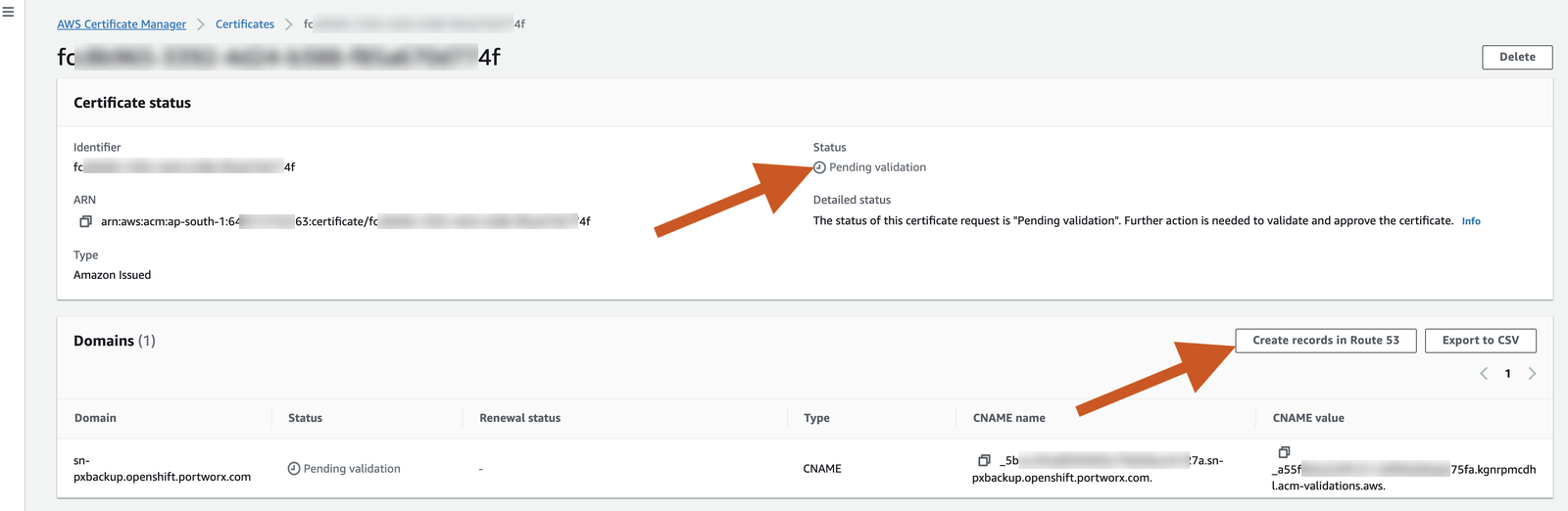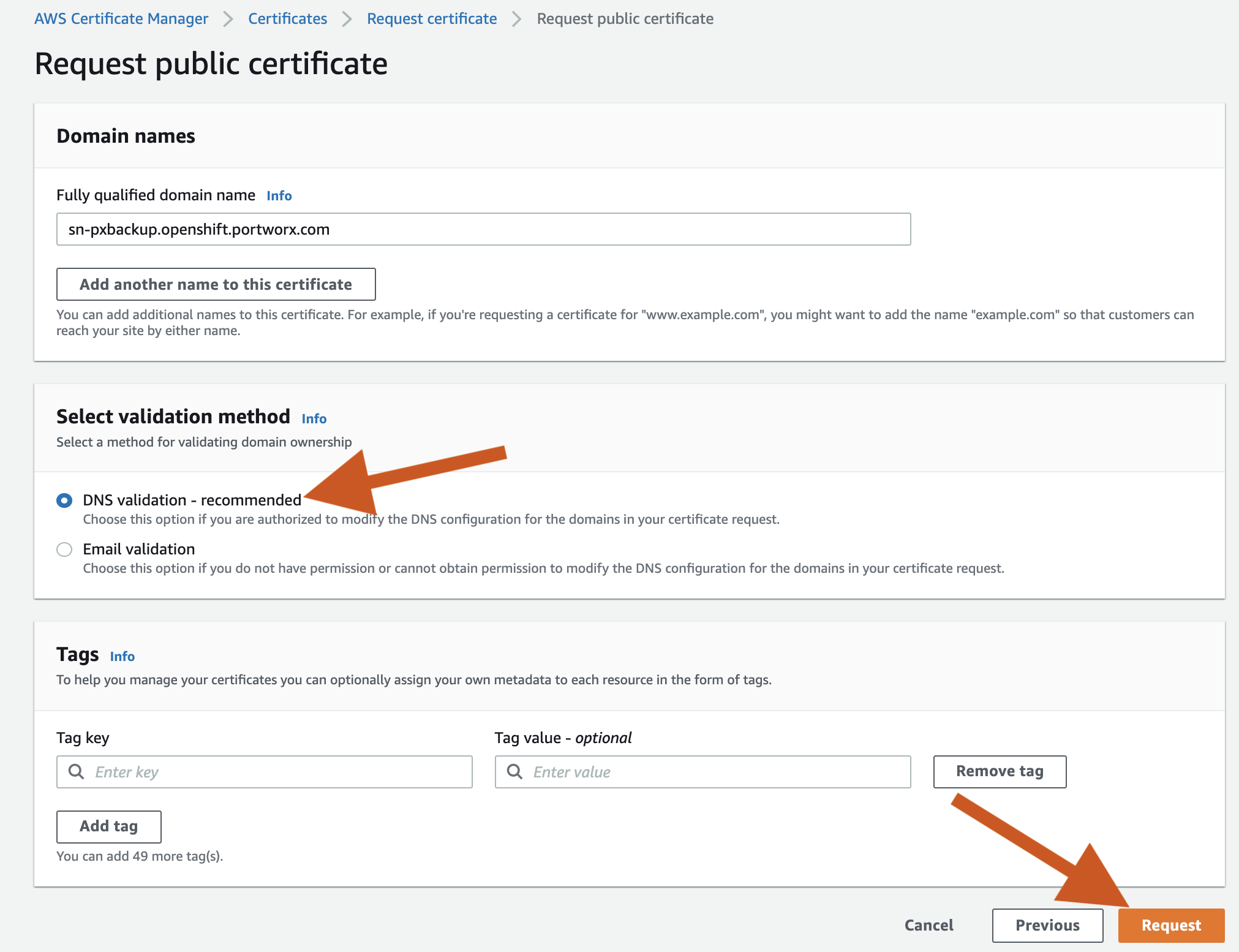 Select Request > Public Certificate > FQDN (sn-pxbackup.openshift.portworx.com) > DNS Validation > Request.