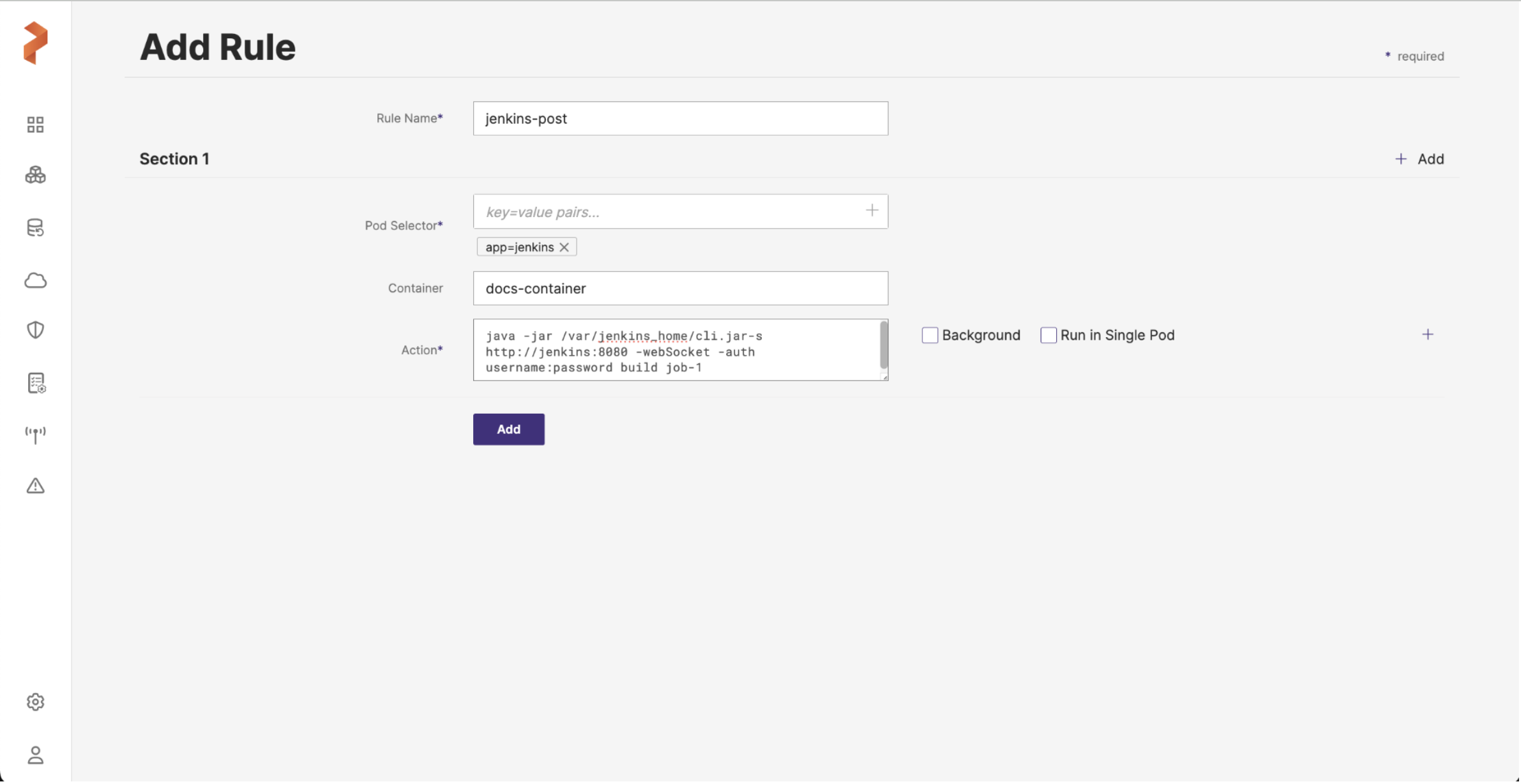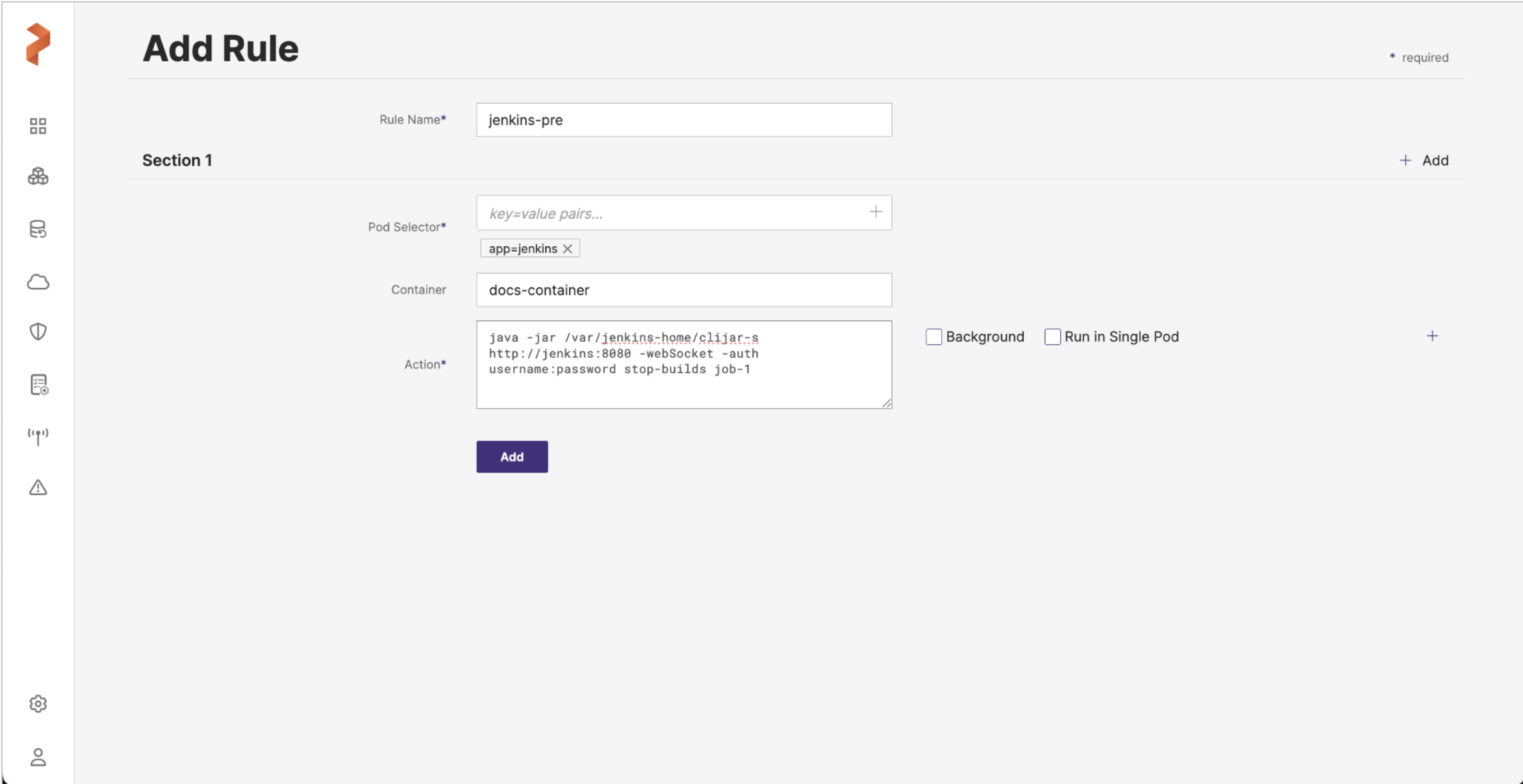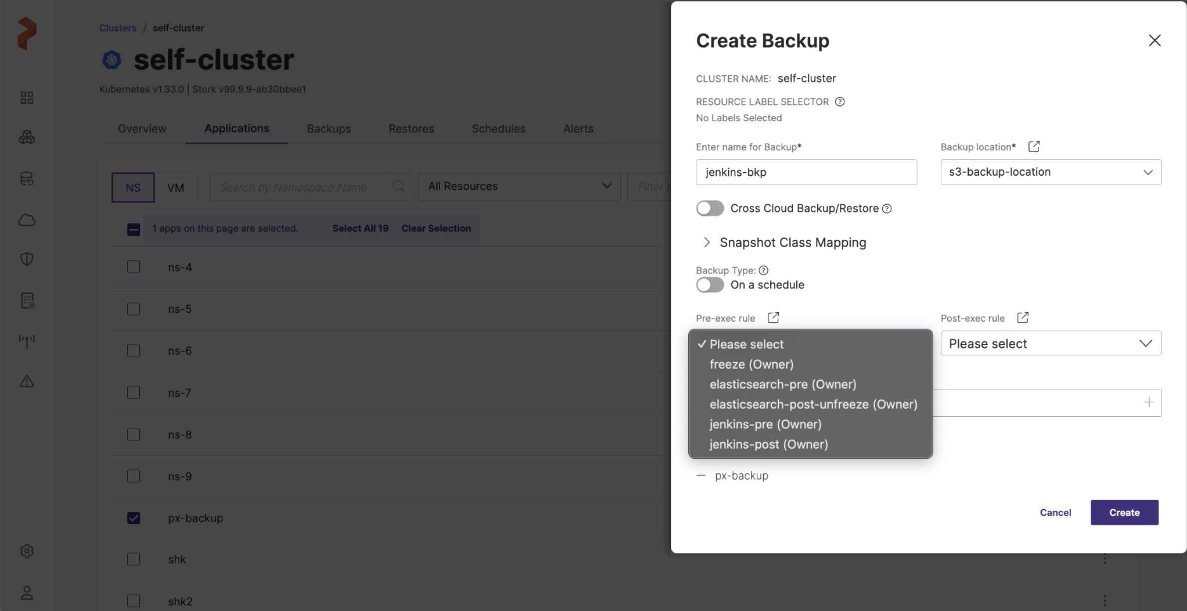 Assume the Jenkins deployment has a job called job-1, you will use the pre-exec rule to make sure this job is stopped before taking our snapshot.