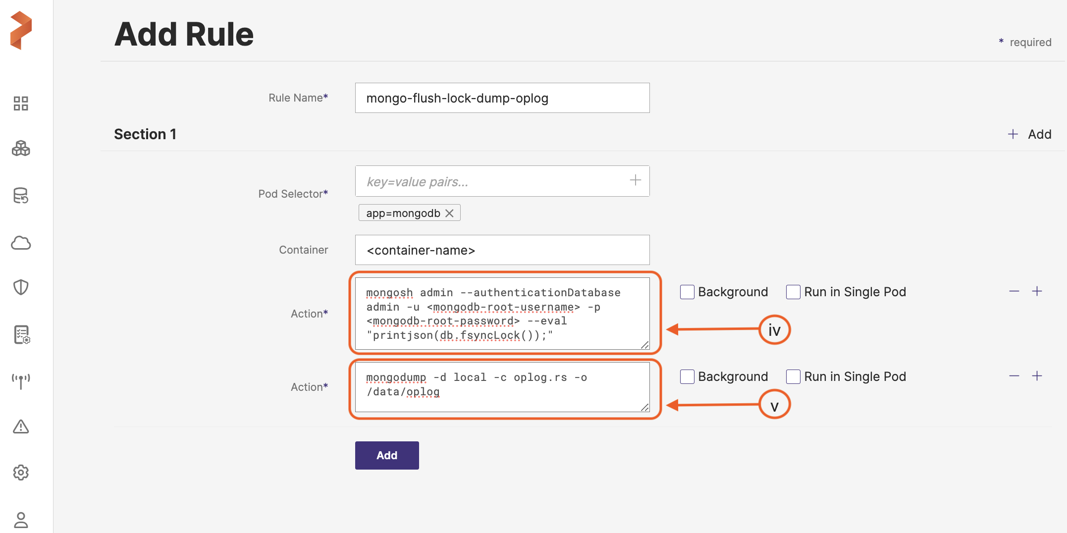 Add the following command in Action field to dump Oplog and can be used for alternate database recovery.