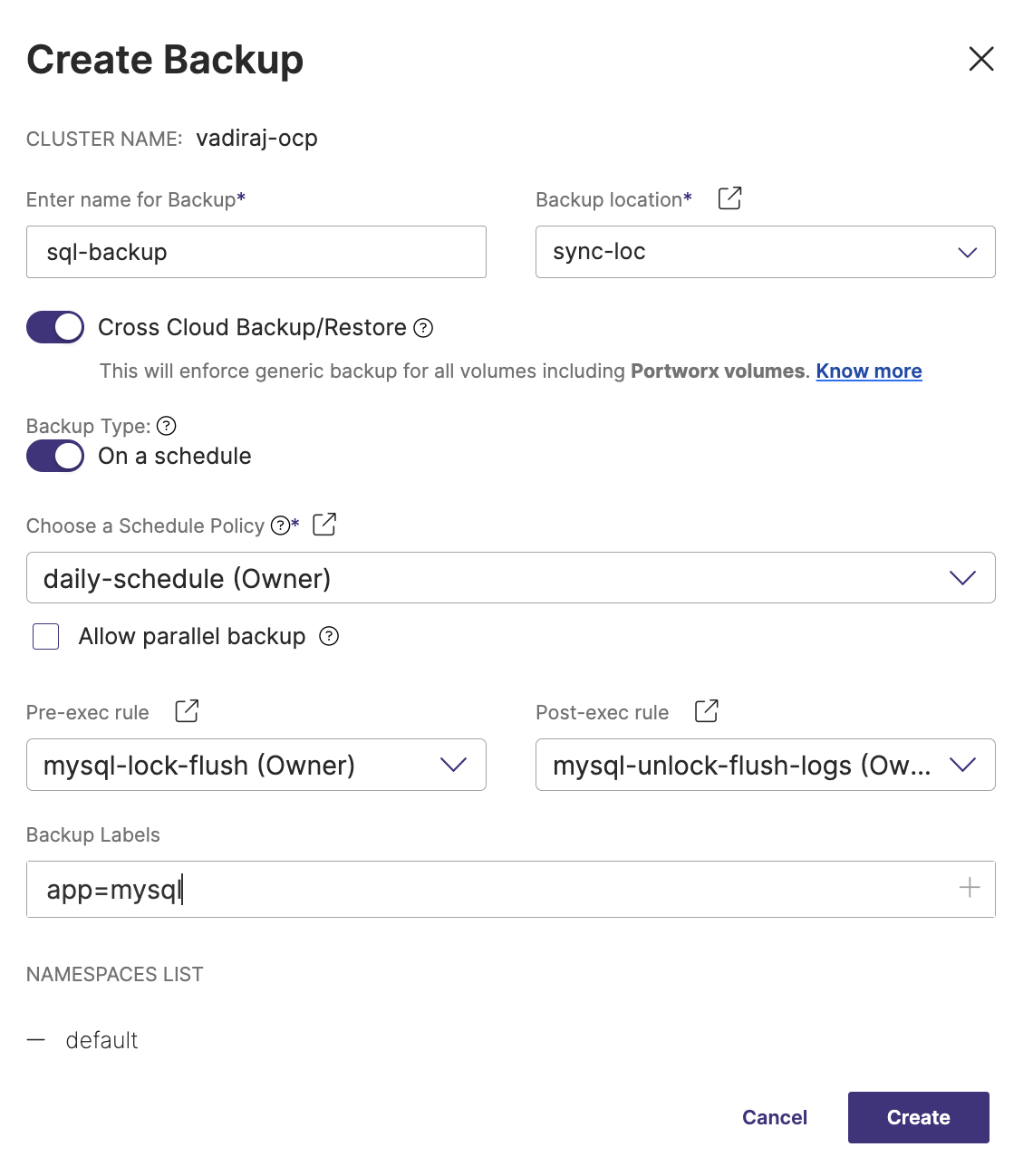 which works well for taking backups specific to MySQL. Since Portworx Backup can provide abstracted backup and restore for a polyglot of data services, we can replicate the best practices of mysqldump, such as flushing and locking logs and tables using Portworx Backup’s pre and post backup rules. Backups and rules can be used across multiple instances of MySQL and multiple types of clouds. This will ultimately simplify operations for devops teams for single or multi-cloud workflows.