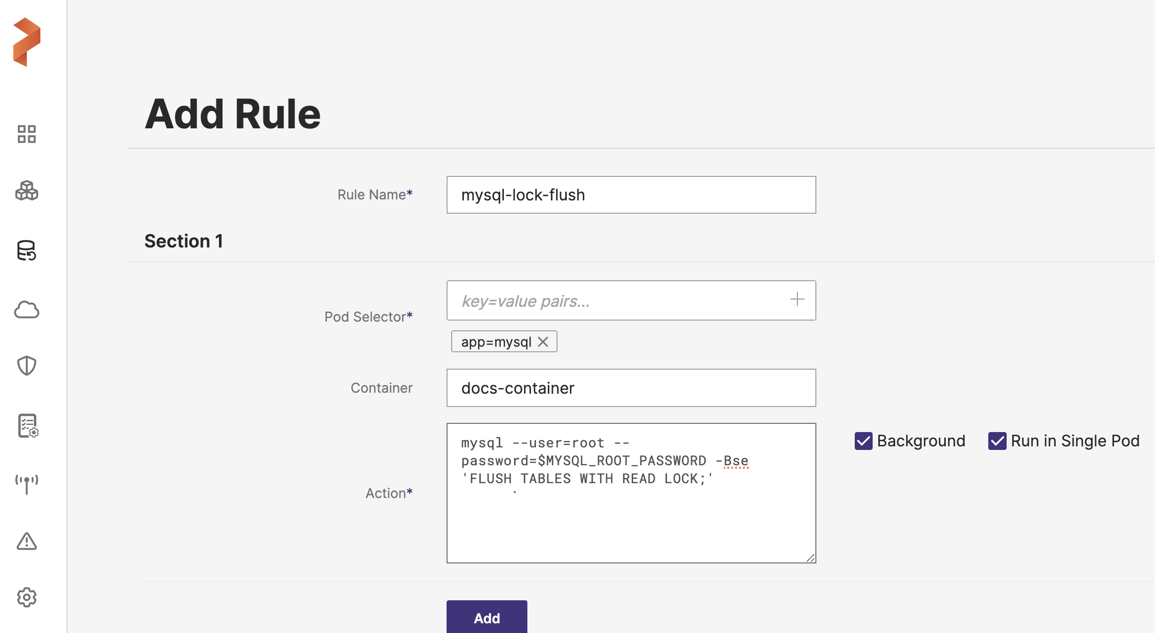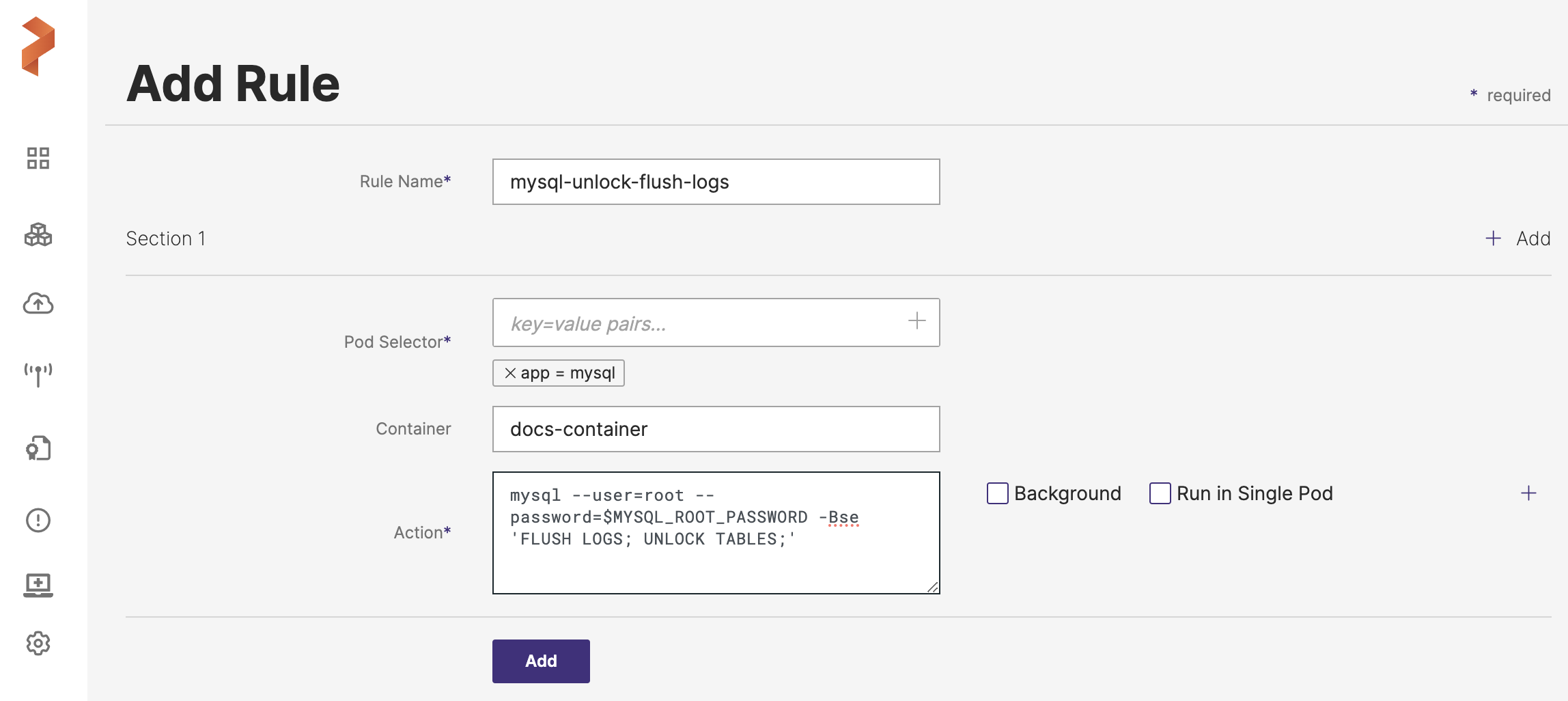 Create the following rule within the Portworx Backup interface. Modify the username and password for how they are configured in your Kubernetes environment.