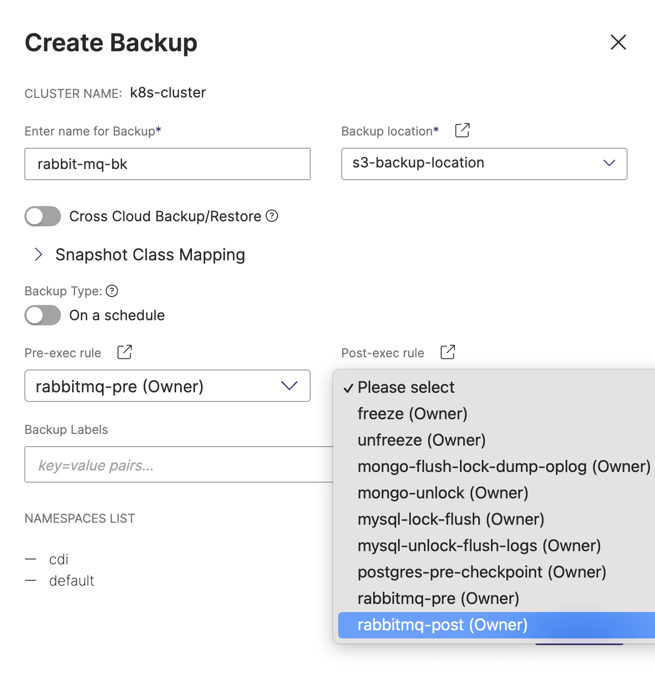 During the backup creation process, select the rules in the pre-exec and post-exec dropdown lists: