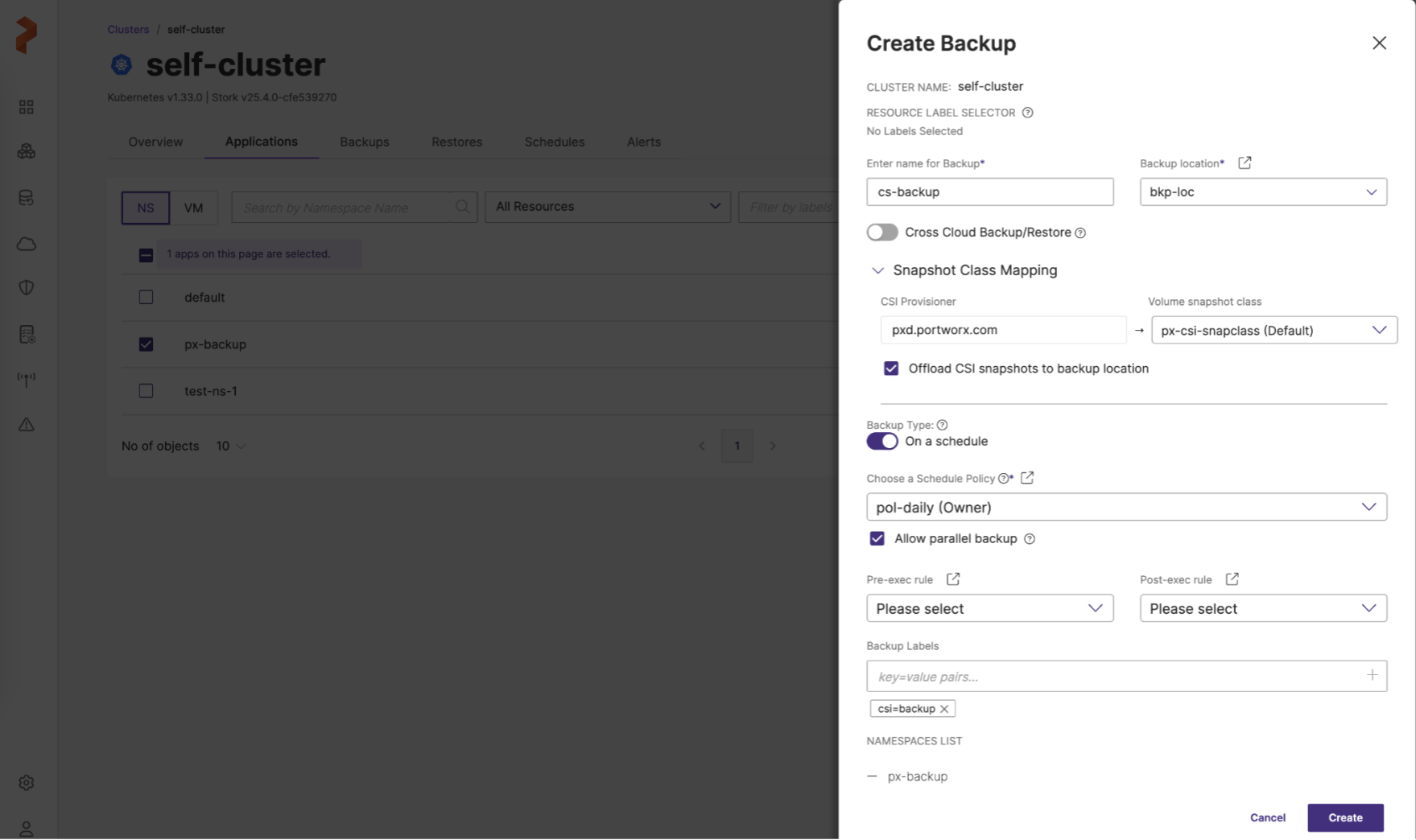 - Non-Portworx (CSI-based): creates CSI snapshot if Offload CSI snapshots to backup location is not selected