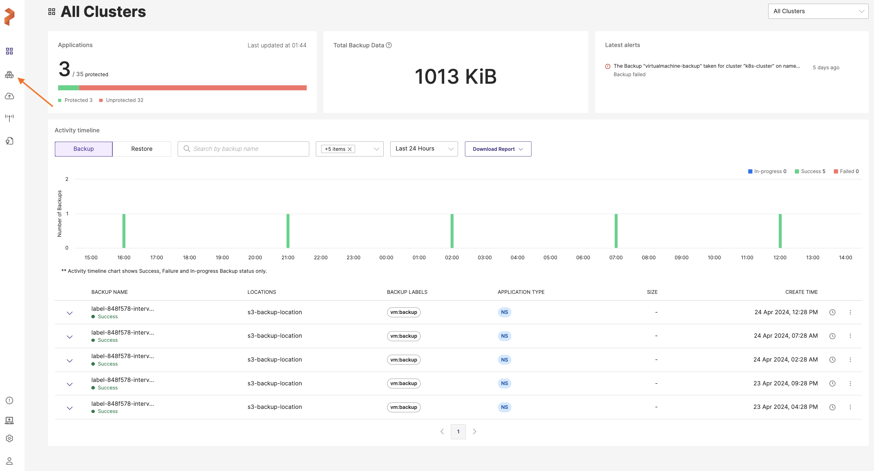 1. From the Portworx Backup home page, click on the Clusters icon in the left navigation pane.