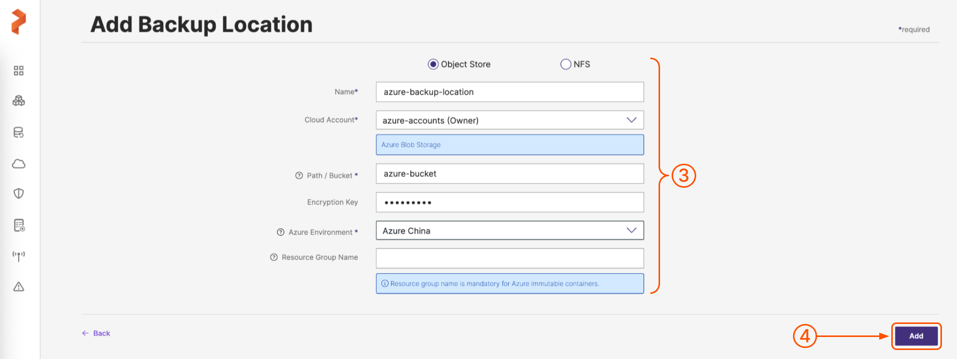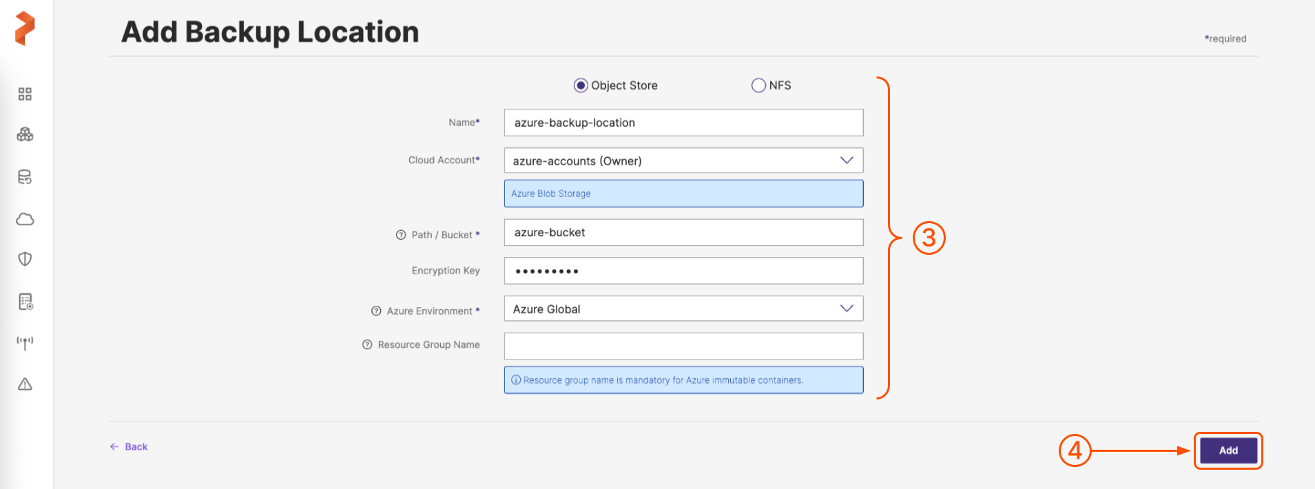 Populate the fields on the Add Backup Location page as follows: