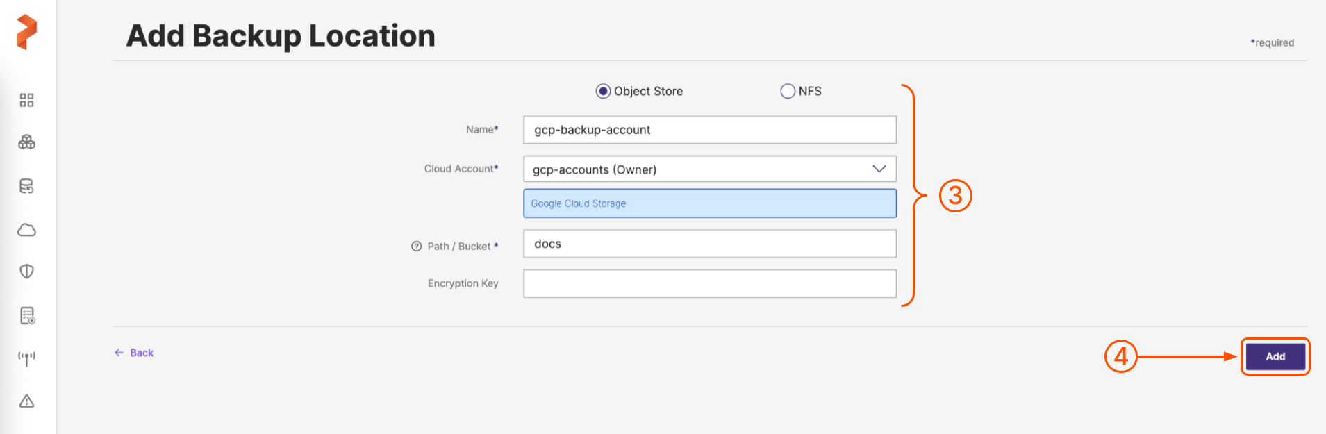 Encryption key (Optional): enter the optional encryption key to encrypt your backups in-transit. For more information on encryption support, refer Encryption matrix.