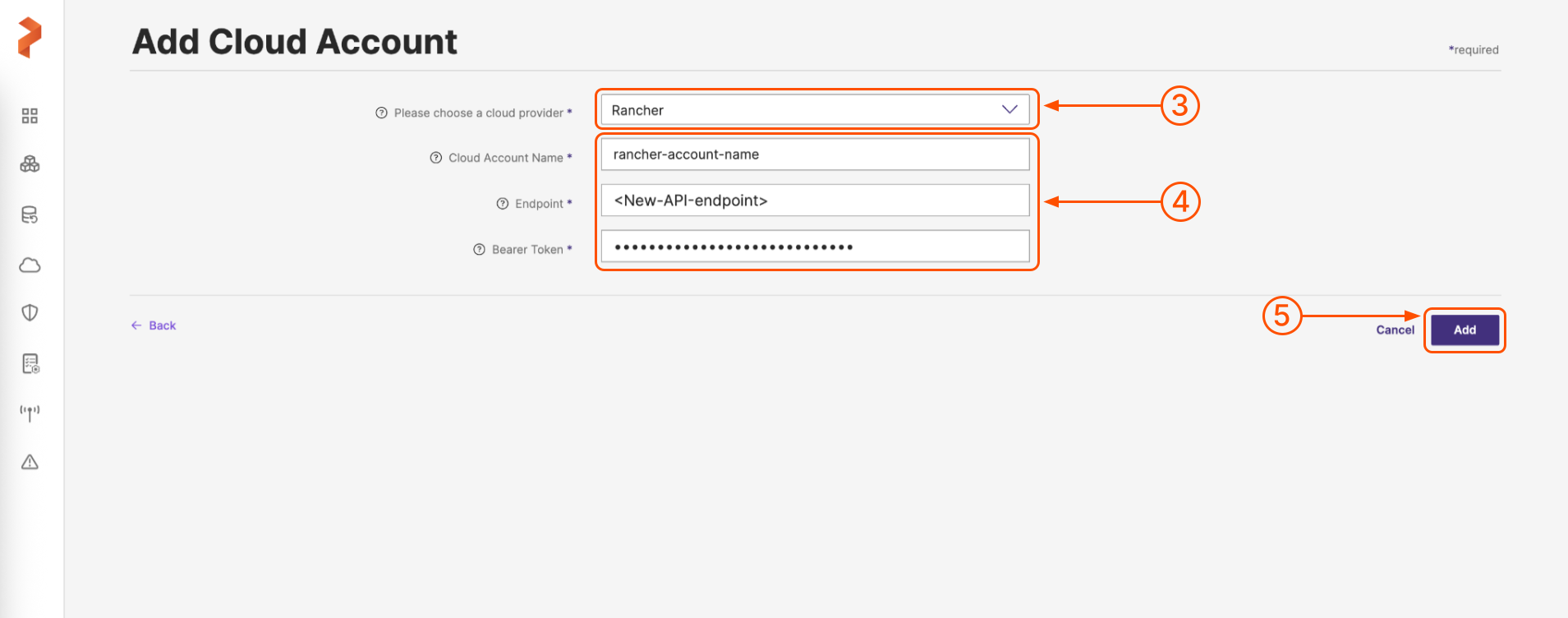 On the Add Cloud Account page, choose a cloud provider: Rancher from the drop-down list in the Please choose a cloud provider input field.