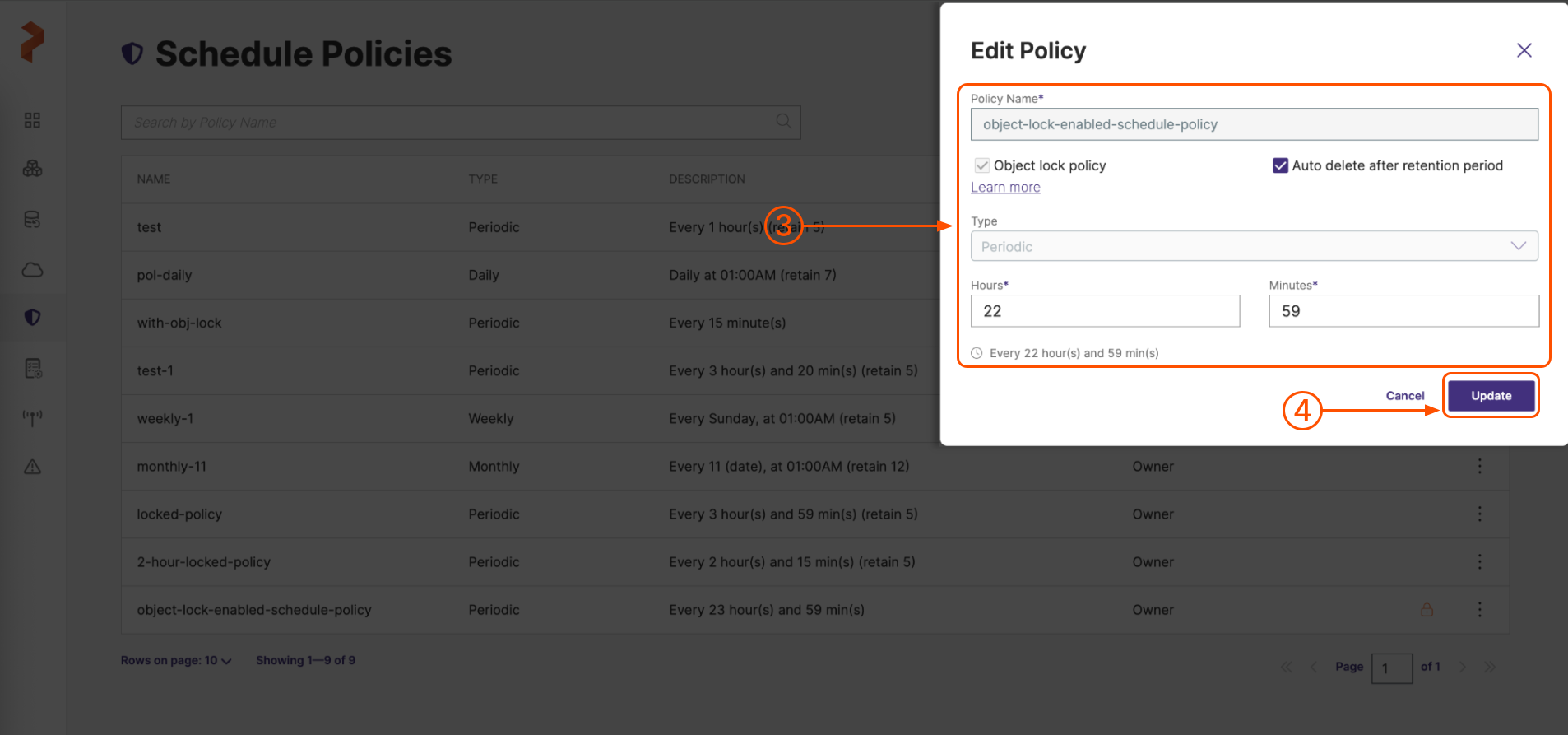 You can modify the following settings with update option for an object lock enabled schedule policy: