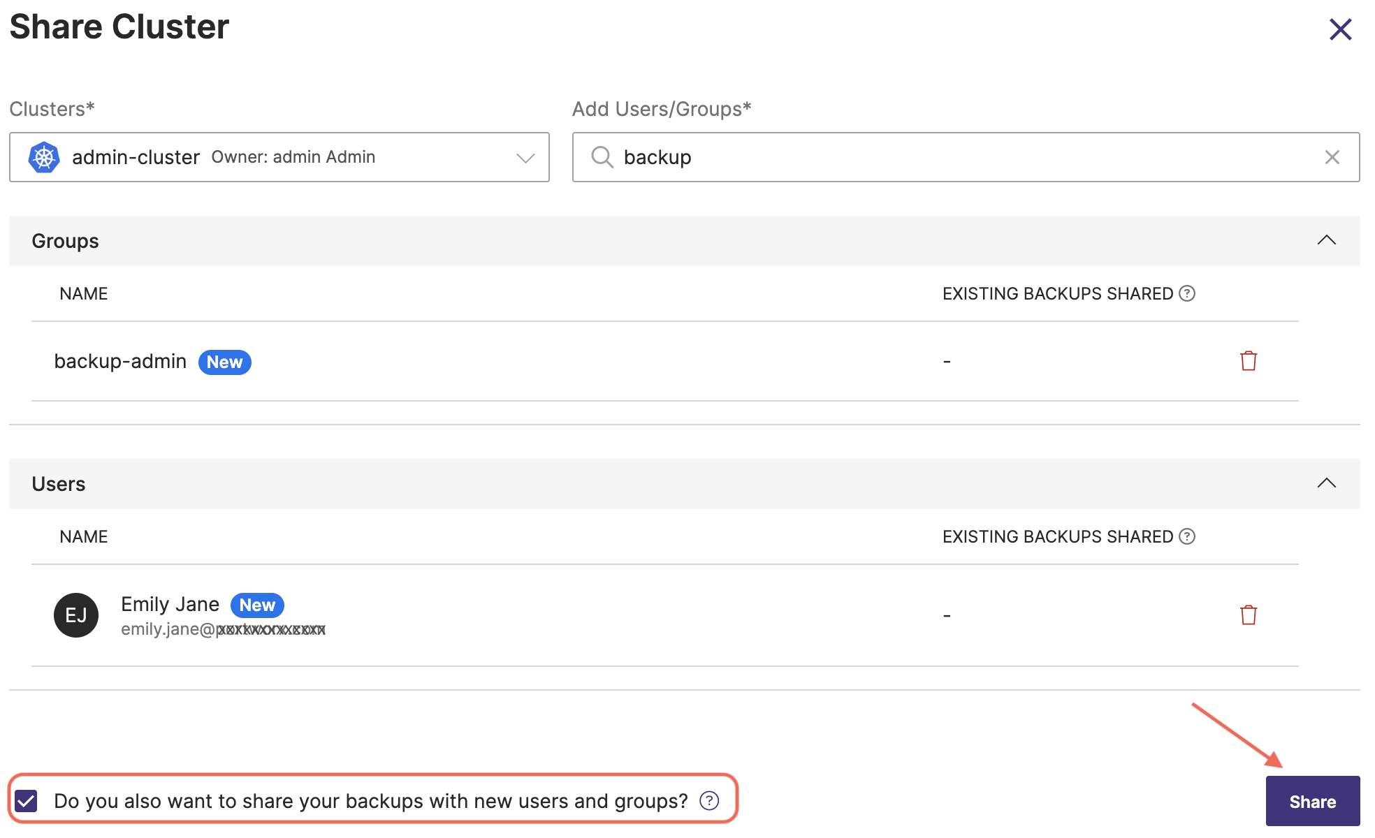 noteIf you selected the Do you also want to share your backups with new users and groups option when sharing the cluster, this setting remains enabled (checked) when you later choose to unshare the cluster from those users and/or groups. If you did not select it initially, the option remains disabled.